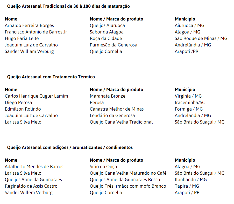 Doze dos 15 finalistas da primeira etapa do Prêmio CNA Brasil Artesanal Queijos são de Minas Gerais, dos municípios de Airuoca, Alagoa, São Roque de Minas, Andrelândia, Virgínia, Formiga, São Brás do Suaçuí, Itanhandu e Tapira. Os outros dois são de Arapoti (PR) e Iraceminha (SC). Ao todo, a iniciativa visa premiar os produtos artesanais inscritos em três categorias: queijos artesanais com tratamento térmico; queijos artesanais com 30 a 180 dias de maturação; e queijos artesanais com adições/aromatizados/condimentados.