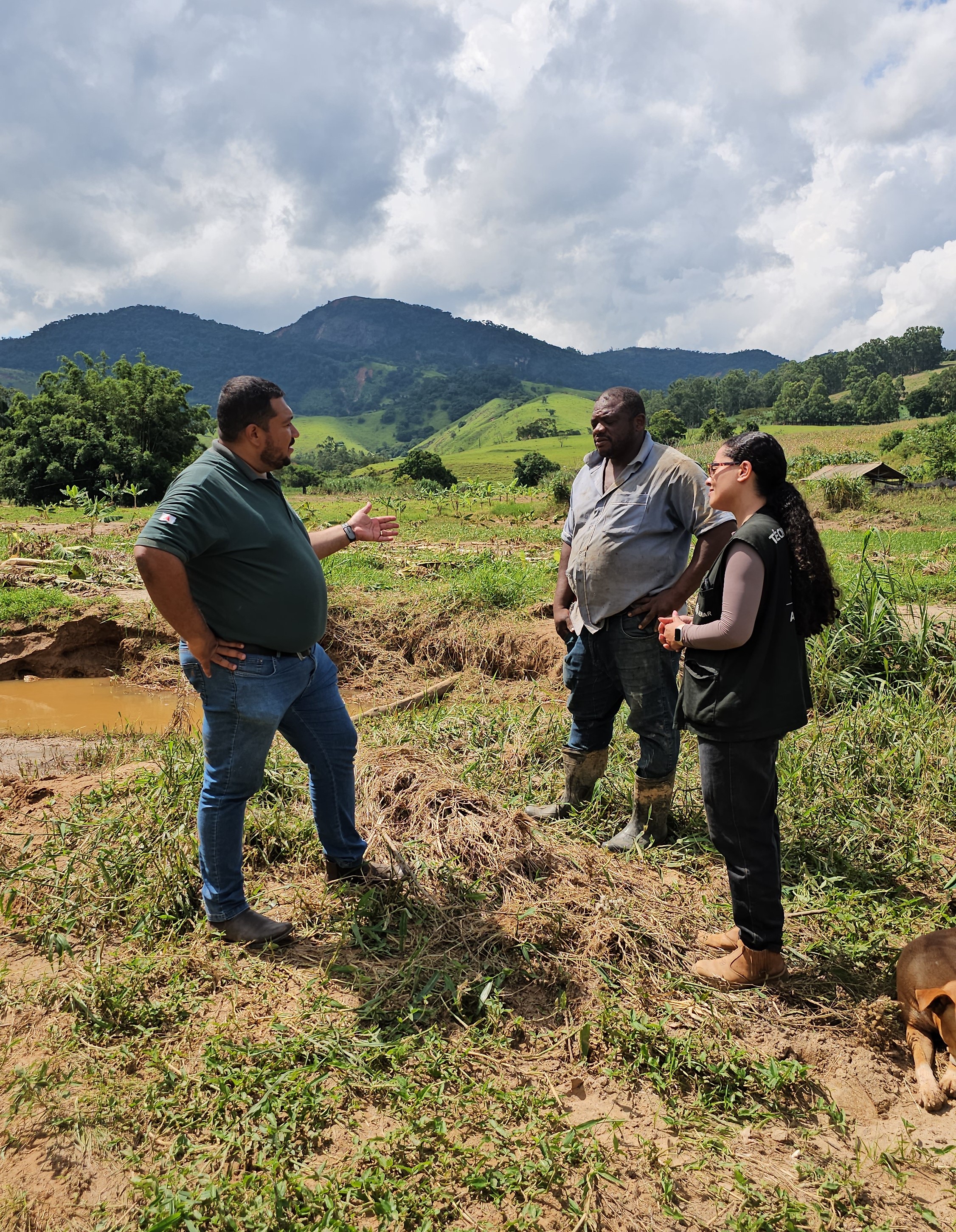 Luiz Fernando olha com desgosto para a área onde há dez dias havia duas mil covas de banana. A chuva da noite de 23 de fevereiro encheu rapidamente o córrego Miragaia, que passa dentro da propriedade, e a força da água derrubou todo o bananal e outras plantações do produtor. “Encheu tudo, parecia um mar, e vinha forte como uma onda”, relembra. A técnica de campo Karina Soares, que atende Luiz Fernando pelo programa de Assistência Técnica e Gerencial (ATeG) do Sistema Faemg Senar, também não esconde a tristeza ao ver a situação do sítio. “Luiz Fernando é um produtor muito empenhado. Em oito meses de trabalho conjunto, conseguimos mudar muita coisa. Quando cheguei aqui e vi que toda a adubação que fizemos, o estoque de nutrientes, tanto da banana, quanto do quiabo, jiló, foi tudo levado, é desolador”.